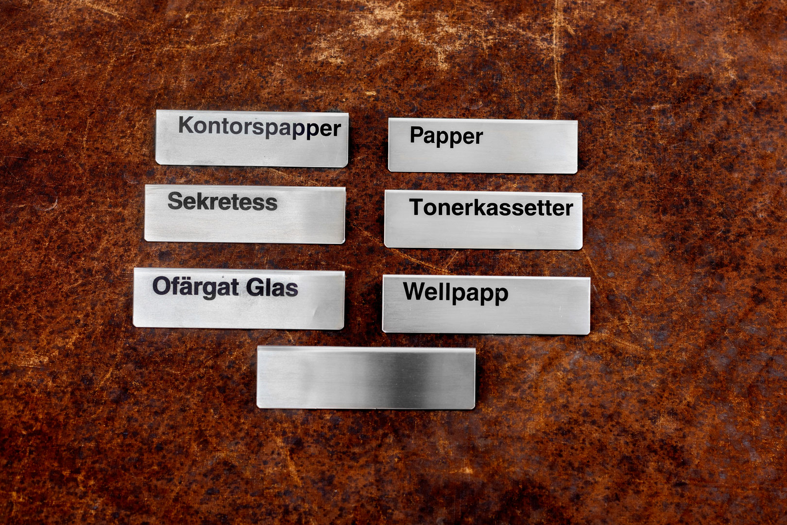 SKYLTTEXTER: Aluminiumburkar Batterier Blandat kontorspapper Brännbart Elektronik Farligt avfall Färgat glas Glas Hårdplast Komposterbart Kopieringspapper Lampor Metallförpackningar Metall Papper Pappersförpackningar Petflaskor Plast Returglas Returpapper Sekretess Skräp Tonerkassetter Wellpapp Ofärgat glas Övrigt Skylt utan text