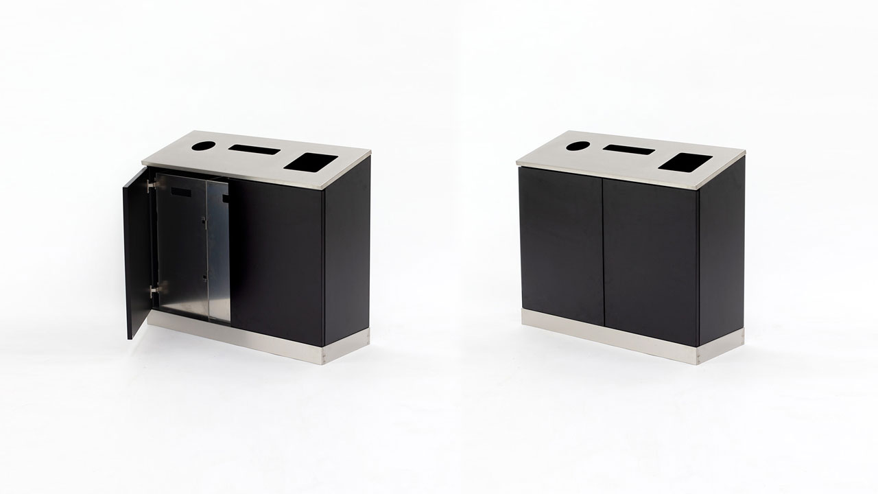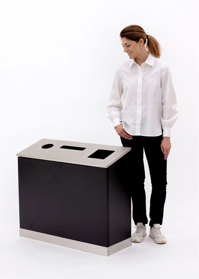 BESKRIVNING: Small Trippel för källsortering av tre fraktioner i lobby eller andra utrymmen. Den har rostfri topp med hål för flaskor, tidningar och övrigt skräp. Nederdelen har sockel med förstärkning av rostfri plåt.