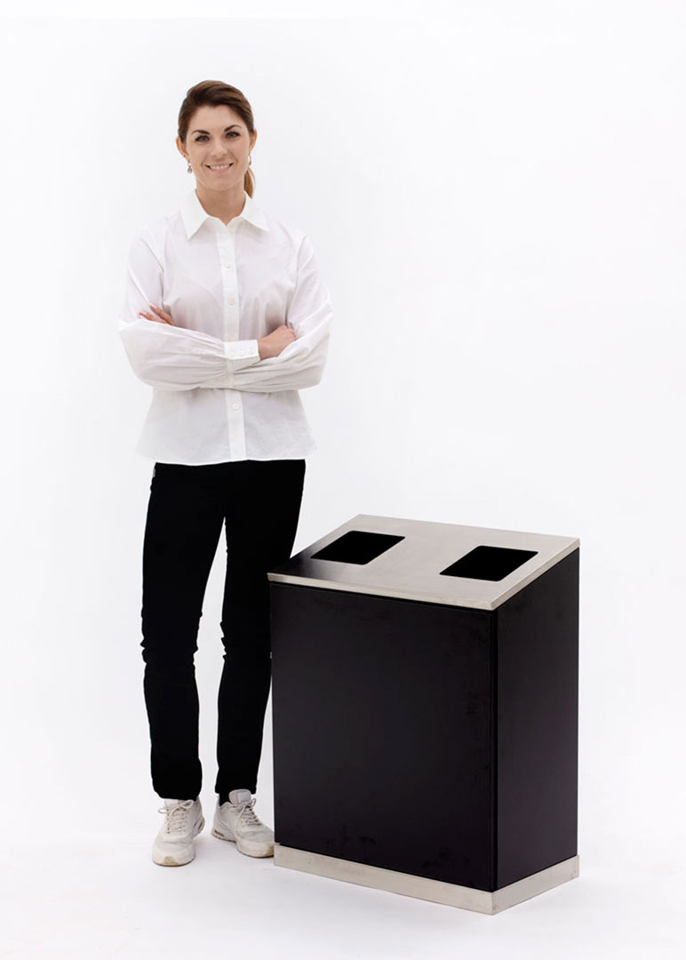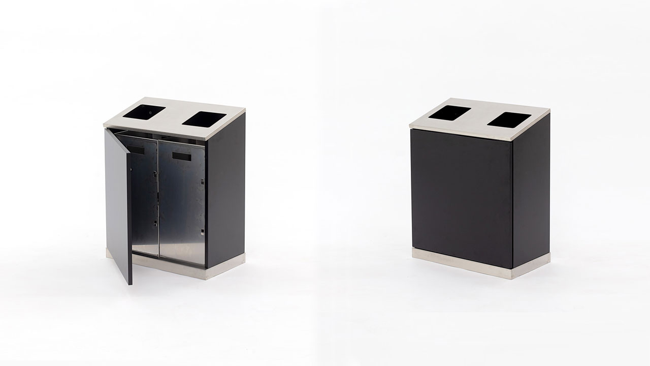 BESKRIVNING: Small Duo för källsortering av två fraktioner. Nederdelen har sockel med förstärkning av rostfri plåt.